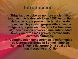 El documento describe la enfermedad diarrea por Shigella sonnei, la cual es causada por una bacteria que se transmite a través del contacto con heces o consumo de alimentos contaminados. Entre diciembre de 2008 y abril de 2009 hubo 104 brotes en Chile que afectaron principalmente a niños menores de 10 años. Los síntomas van desde diarrea leve a disentería con sangre, y se recomiendan medidas de higiene como lavarse las manos para prevenir la transmisión.