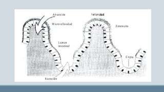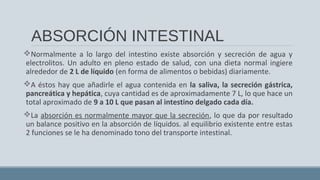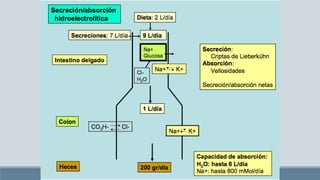 Este documento describe los mecanismos de absorción intestinal y diarrea. Explica que la absorción intestinal normalmente supera la secreción, manteniendo un balance positivo de líquidos. Cualquier cambio que altere este equilibrio puede causar diarrea. Luego detalla varios mecanismos por los cuales diferentes patógenos pueden producir diarrea, como la secreción de toxinas, la invasión celular, o la adhesión a enterocitos. Finalmente clasifica los tipos de diarrea y sus principales causas.