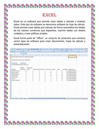 Excel es un software de hoja de cálculo que permite crear tablas, calcular y analizar datos, calcular totales automáticamente y crear gráficos simples. Forma parte del paquete Office junto con otros programas para documentos, hojas de cálculo y presentaciones.