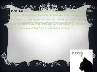 El documento explica el origen de los nombres de los días de la semana en latín y sus referencias a dioses y planetas de la mitología romana y griega. Lunes se refiere al día de la luna, martes a Marte el dios de la guerra, miércoles a Mercurio el dios del comercio, jueves a Júpiter el dios del cielo, viernes a Venus la diosa del amor, sábado significa descanso en hebreo, y domingo se refiere al día del Señor para los crist
