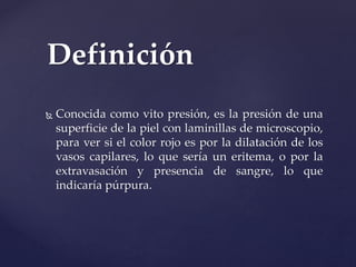 La diascopia, también conocida como transiluminación, es una técnica médica donde se presiona la piel con una lámina de vidrio para determinar si un color rojo en la piel es debido a la dilatación de los vasos capilares (eritema) o a la extravasación de sangre (púrpura). Si el color rojo persiste bajo presión, indica una extravasación sanguínea; si el color desaparece o blanquea, significa una dilatación vascular. La diascopia ayuda a diagnosticar diferentes condiciones médicas.