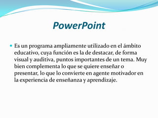PowerPoint es un programa ampliamente utilizado en la educación para destacar puntos importantes de forma visual y auditiva, lo que lo convierte en una herramienta motivadora para la enseñanza y el aprendizaje. El documento proporciona instrucciones detalladas sobre cómo usar las diversas funciones de PowerPoint, incluida la creación y formato de diapositivas, la inserción de texto, imágenes, tablas, gráficos y otros objetos, y la aplicación de animaciones y efectos.