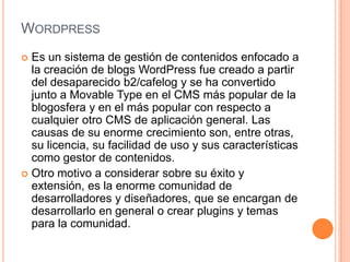 Este documento proporciona información sobre varios temas relacionados con la gestión de contenidos y las redes sociales. Explica brevemente lo que son WordPress, Delicious y Red Alumnos, destacando sus características principales y funcionalidades.