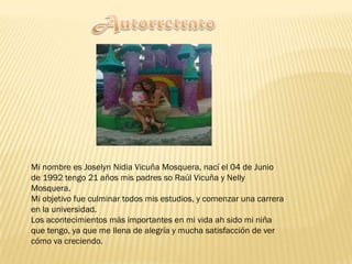Este documento presenta un resumen biográfico de Joselyn Nidia Vicuña Mosquera. Nació el 4 de junio de 1992 en Ecuador y tiene 21 años. Sus padres son Raúl Vicuña y Nelly Mosquera. Su objetivo principal es completar sus estudios universitarios. El evento más importante en su vida ha sido el nacimiento de su hija.