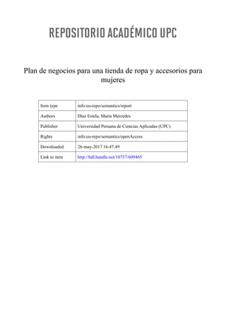 Este documento presenta un plan de negocios para una tienda de ropa y accesorios para mujeres. Se analiza el mercado, la competencia y las oportunidades que existen. Se identifica como público objetivo a mujeres de los segmentos socioeconómicos B y C entre 18 y 35 años. El plan estratégico propone ofrecer productos variados, novedosos y de buena calidad a través de una tienda física y página web. El análisis financiero muestra que el proyecto es viable con una inversión inicial de S/. 75