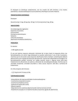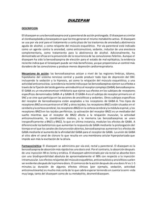El documento describe dos benzodiazepinas, diazepam y midazolam. El diazepam se usa oralmente y parenteralmente para tratar trastornos de ansiedad, convulsiones y abstinencia al alcohol. Actúa uniéndose a receptores en el cerebro que modulan el neurotransmisor GABA. El midazolam se usa intravenosamente para sedación, teniendo efectos sedantes, amnésicos y relajantes musculares de corta duración. Ambos fármacos pueden causar depresión respiratoria y cardiovascular si se usan en