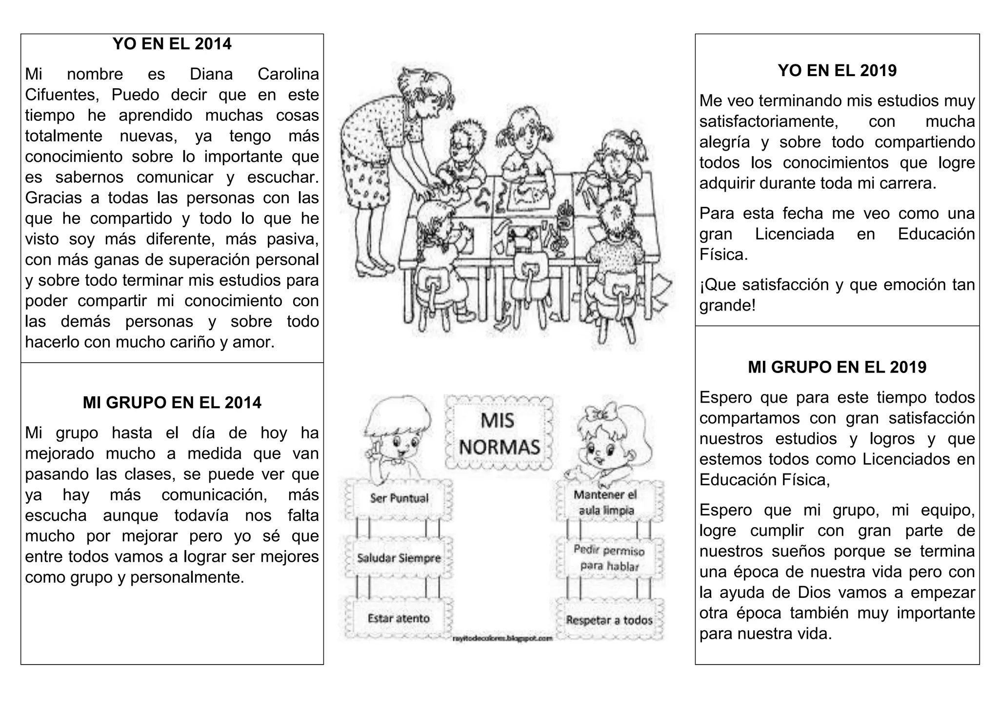 Diana Carolina Cifuentes describe su crecimiento personal y académico entre 2014 y 2019. En 2014, aprendió sobre la importancia de la comunicación y escucha. Para 2019, se ve terminando sus estudios como licenciada en educación física y compartiendo sus conocimientos. En cuanto a su grupo en 2014, ve mejoras en la comunicación aunque queda trabajo por hacer, mientras que para 2019 espera que todos hayan terminado sus estudios como licenciados en educación física.