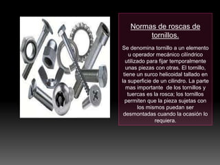 Este documento describe los diferentes tipos de tornillos roscados y sus normas. Explica que los tornillos permiten unir piezas de manera temporal mediante una rosca helicoidal y que existen diferentes tipos como de cabeza hexagonal, ranurada o con pivote. También presenta las normas DIN y UNE-EN que regulan las dimensiones de las roscas.
