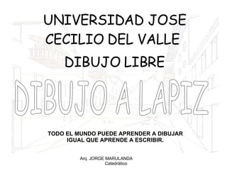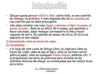 El documento presenta una introducción a la técnica del dibujo a lápiz impartida por el Arquitecto Jorge Marulanda. Explica cómo se usa el lápiz para lograr trazos limpios y sombras, a través de ejercicios prácticos de líneas, curvas, polígonos y sombreado. También cubre temas como la importancia de la visión de conjunto, tipos de lápices, formas de afilado, y conseguir un trazo seguro. El objetivo final es que los estudiantes aprendan a representar volumen