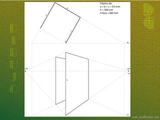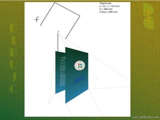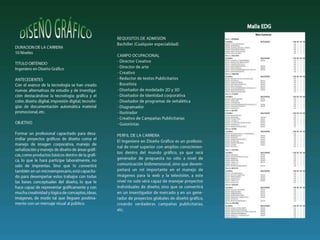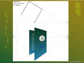 El documento presenta un tríptico que se entrega a los nuevos estudiantes de la Escuela de Diseño Gráfico. El tríptico contiene información sobre la carrera como sus antecedentes, objetivos, título obtenido, perfil, duración y campo ocupacional, así como la malla curricular. El tríptico fue diseñado con dos puntos de fuga y se muestran los pasos para proyectar una sombra en el diseño.