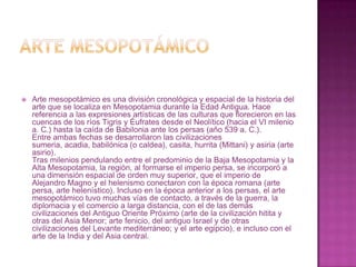 El arte mesopotámico se desarrolló entre el VI milenio a. C. y el 539 a. C. en la región de Mesopotamia entre los ríos Tigris y Éufrates, dando lugar a las civilizaciones sumeria, acadia, babilónica, casita, hurrita y asiria. La cerámica fue un elemento clave de la cultura material desde el Neolítico, ya que permitió identificar el origen y datación de las piezas arqueológicas.