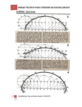 Este documento presenta información sobre dibujo técnico para estudiantes de tercer año de bachillerato. Explica conceptos como el sistema diedrico de proyección, proyección ortogonal, selección de vistas, construcción de vistas auxiliares y ejemplos de dibujo en isometría. El documento fue compilado por el ingeniero Luis Paucar Limaico y contiene instrucciones y definiciones para que los estudiantes comprendan mejor los principios del dibujo técnico.