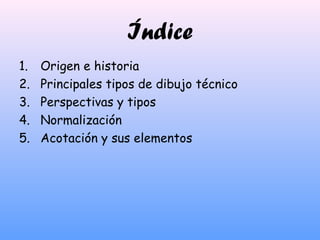 Este documento describe el origen e historia del dibujo técnico, sus principales tipos como el dibujo arquitectónico y el dibujo mecánico, las perspectivas más utilizadas como la caballera y la isométrica, la normalización de las medidas y procesos, y los elementos de la acotación como las líneas y símbolos de cota.