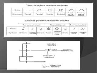 El documento describe los diferentes tipos de tolerancias que se utilizan para especificar los límites de variación aceptables en las dimensiones y formas de piezas fabricadas. Incluye tolerancias dimensionales que establecen un rango para las medidas de las piezas, tolerancias geométricas que controlan formas individuales o relaciones entre formas, y diferentes tipos de ajustes entre piezas macho y hembra que forman acoplamientos mecánicos.
