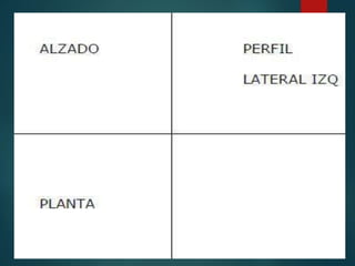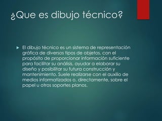 El dibujo técnico es un sistema gráfico que representa objetos para proporcionar información que facilite su análisis, diseño, construcción y mantenimiento. Incluye vistas como el alzado, perfil y planta para mostrar el objeto, así como perspectiva, planos acotados, cortes y secciones para mostrar detalles internos y dimensiones.