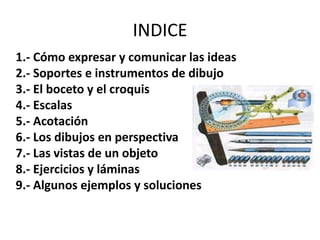 Este documento describe los principales métodos para expresar y comunicar ideas técnicas a través del dibujo, incluyendo bocetos, croquis, planos, escalas, acotación, perspectivas y vistas de objetos. Explica los instrumentos de dibujo básicos como papel, lápices, compás, regla y escuadra. También incluye ejercicios prácticos para que los estudiantes desarrollen estas habilidades técnicas de representación gráfica.