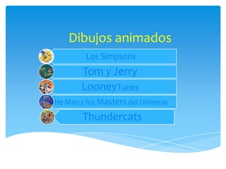 Este documento enumera seis populares series de dibujos animados de la década de 1980 que incluyen Los Simpsons, Tom y Jerry, Looney Tunes, He-Man y los Masters del Universo y Thundercats.