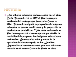 El documento resume la historia temprana de los dibujos animados. Emile Reynaud creó uno de los primeros sistemas para proyectar imágenes animadas en 1877 llamado Praxinoscopio. J. Stuart Blackton produjo uno de los primeros cortometrajes de animación en 1906 titulado Fases divertidas usando la técnica de stop-motion. Georges Méliès asistió a la primera proyección cinematográfica de los hermanos Lumière y luego creó su propia película y la obra maestra Le Voyage Dans la Lune en 1902.