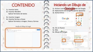 El documento detalla los pasos para utilizar Dibujos de Google, incluyendo la inserción de texto, imágenes, y formas, así como el formato de estos elementos. Se explican opciones como insertar WordArt, ajustar características de texto y recortar imágenes. Además, se abordan herramientas de edición disponibles en la interfaz de Dibujos de Google.