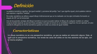 Este documento explica qué son los dibujos isométricos y cómo se realizan en AutoCAD. Los dibujos isométricos son un tipo de perspectiva que muestra tres caras principales de un objeto deformadas en la misma proporción, con líneas dirigidas a 30, 90 y 150 grados de la horizontal. Esto permite representar objetos tridimensionales de manera rápida y efectiva. El documento incluye definiciones, características, ejes y un ejemplo práctico de cómo dibujar un cubo, cilind