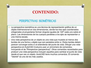La perspectiva isométrica representa objetos tridimensionales en dos dimensiones formando ángulos de 120° entre los ejes. Una proyección isométrica mide las dimensiones paralelas a los ejes principales (X, Y, Z) a la misma escala, formando ángulos de 120° entre sí. El documento explica cómo realizar dibujos isométricos en AutoCAD, incluyendo configurar las propiedades, dibujar a escala, y recortar las áreas no visibles.