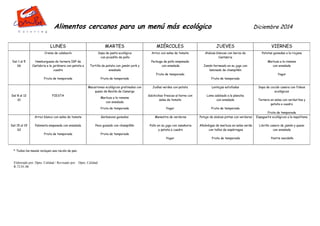 Este documento presenta el menú de diciembre de 2014 para una escuela en Cantabria, España. El menú incluye platos hechos en casa con ingredientes locales como verduras, fruta, pasta, arroz y legumbres ecológicas, queso y carne de ternera de la región. Los menús semanales cumplen con las recomendaciones nutricionales para niños de 3-5 años y 6-12 años.