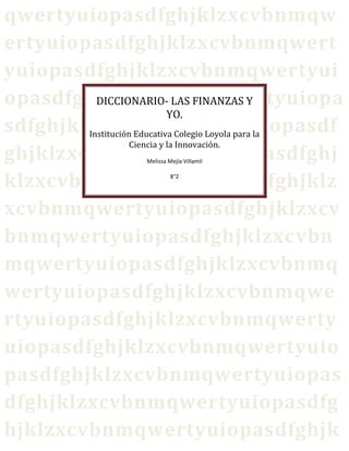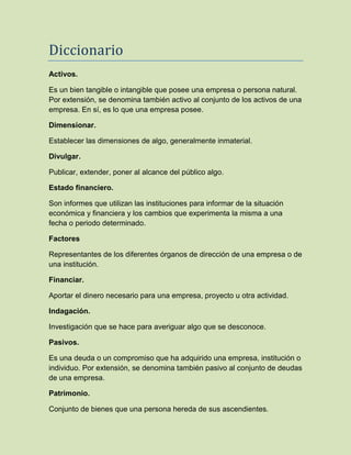 Este documento presenta un diccionario breve de términos financieros comunes como activos, dimensionar, divulgar, estado financiero, factores, financiar, indagación, pasivos, patrimonio y slogan. Explica el significado de cada término de manera concisa.