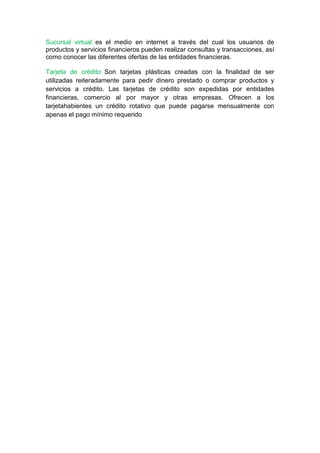 El documento describe varios conceptos financieros clave. Corresponsal No Bancaria-Bancolombia (CNB) son establecimientos autorizados que ofrecen servicios bancarios limitados. Estado de Pérdidas y Ganancias muestra los ingresos, gastos y utilidad de un periodo. Flujo de caja mide los cambios en efectivo aplicados a un periodo. Puntos de Atención Móvil – Bancolombia son asesores móviles que ofrecen productos bancarios.