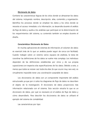 Un diccionario de datos es un catálogo que contiene información sobre los elementos de datos y flujos de datos de un sistema. Incluye detalles como los nombres, descripciones y estructuras de los datos, así como los procesos y almacenes de datos donde se utilizan. Se desarrolla durante el análisis de flujo de datos para documentar y coordinar las definiciones de datos entre los analistas, y ayudar a determinar los requisitos del sistema.
