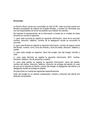 El documento describe un modelo de datos para la florería Rosa, que incluye información sobre sucursales, floristas, arreglos, oficinistas y pedidos. Cada entidad se detalla con atributos específicos para su identificación y gestión, tales como claves, nombres, direcciones y teléfonos. Se requiere la consideración de atributos multivaluados y compuestos en el diseño del diccionario de datos.