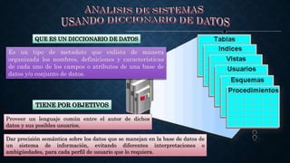 Un diccionario de datos es un metadato que lista y define los campos y atributos de una base de datos de manera organizada. Provee un lenguaje común entre los creadores de datos y sus usuarios, y evita ambigüedades. Los diccionarios de datos deben mantenerse actualizados y estar disponibles para todos los usuarios de datos.