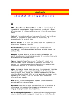 El documento define varios términos técnicos relacionados con la tecnología de la información y las comunicaciones. Incluye definiciones de conceptos como ADSL, ActiveX, Acrobat Reader, antivirus, correo electrónico, discos duros, Ethernet, firewalls, HTML y más. El documento provee una guía concisa de los principales términos usados en computación e Internet.