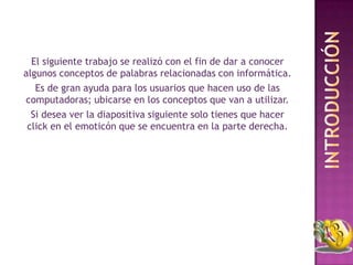 El documento define términos relacionados con informática como arroba, avatar, algoritmo, base de datos, binario, Bluetooth, browser, ciberespacio, clave de acceso, clipart, cookie, download, duplex, dominio público, e-book, emoticon, firewall, gateway y Google en 3 oraciones o menos.