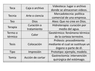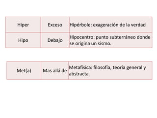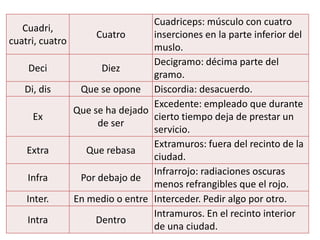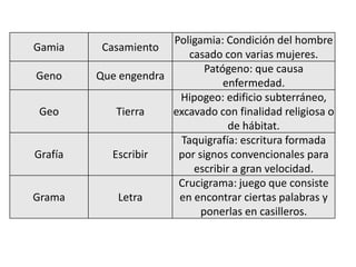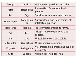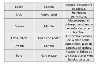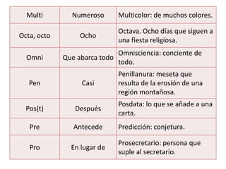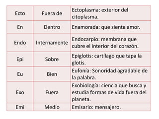 Los vocablos griegos entraron a formar parte de la lengua española a través de prefijos y sufijos. Los prefijos van al comienzo de las palabras para indicar algo antes o sin, mientras que los sufijos se escriben al final de las palabras. Muchos de estos prefijos y sufijos griegos y latinos se unieron para crear nuevas palabras en español.
