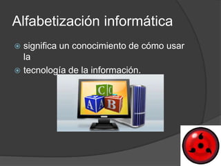 El documento proporciona definiciones de varios términos relacionados con la informática y la tecnología. Explica conceptos como alfabetización informática, backup, bits, contraseñas, datos, digitalización, firewalls, hardware, información, procesamiento de datos, software, virus y más.