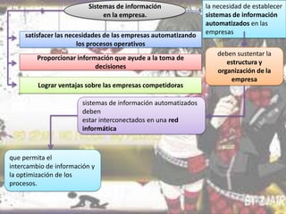 1) El documento habla sobre los sistemas de información en las empresas y cómo estos pueden automatizar procesos, proporcionar información para la toma de decisiones y otorgar ventajas competitivas.