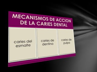 Este documento presenta información sobre la caries dental. Brevemente describe que la caries es una enfermedad multifactorial causada por la acumulación de bacterias en los dientes que producen ácidos que desmineralizan el esmalte. Explica las diferentes teorías sobre los orígenes y mecanismos de la caries desde la antigüedad hasta teorías modernas. Finalmente, menciona algunas consecuencias de la caries como su alta prevalencia en México y la importancia de la prevención a través de una buena higiene