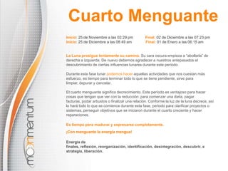 Este documento presenta información sobre las diferentes fases lunares, incluyendo el cuarto menguante, luna nueva, cuarto creciente y luna llena. También describe las energías asociadas a cada fase lunar y recomendaciones y no recomendaciones de actividades para cada período. Además, ofrece detalles sobre la luna fuera de curso y la energía de Lilith.