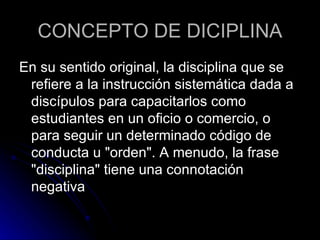 La disciplina se refiere originalmente a la instrucción sistemática dada a los discípulos para capacitarlos en un oficio o código de conducta. Existen diferentes tipos de disciplina como la escolar, que regula el orden y las normas en las escuelas, y la social, que enseña a los niños a comportarse adecuadamente. La disciplina implica instruir a una persona a seguir un código particular de conducta mediante métodos como el castigo o la enseñanza de autocontrol.