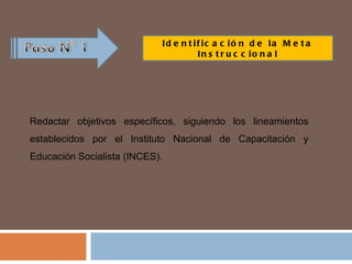 Este documento presenta un modelo para definir objetivos específicos siguiendo los lineamientos del Instituto Nacional de Capacitación y Educación Socialista. El objetivo es que los participantes aprendan a redactar objetivos específicos incluyendo todos sus elementos. Se utilizarán estrategias como análisis de texto, discusión dirigida y práctica guiada. La evaluación incluirá una prueba práctica donde los participantes deberán redactar un objetivo específico y una prueba objetiva para medir su conocimiento.