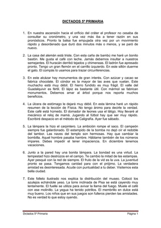 Este documento contiene 28 párrafos con oraciones de dictado para estudiantes de 5o primaria. Las oraciones cubren una variedad de temas y contienen diferentes tipos de palabras, incluyendo nombres, verbos, adjetivos y más para practicar la ortografía, gramática y vocabulario.