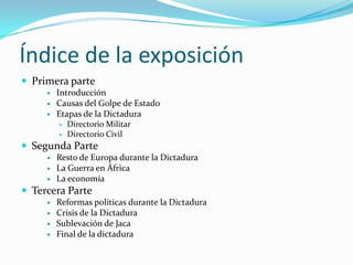La dictadura de Miguel Primo de Rivera en España se extendió desde 1923 a 1930 y consistió en dos etapas: un Directorio Militar inicial presidido por Primo de Rivera hasta 1925, seguido de un Directorio Civil. La dictadura surgió debido a la crisis del sistema político de la Restauración y el descontento del ejército tras la guerra de Marruecos. Aunque hubo algunas reformas, la dictadura enfrentó creciente oposición e inestabilidad que llevaron a su caída y al establecimiento de la Segunda Rep