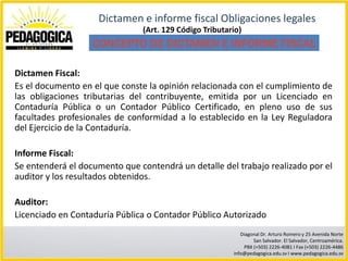 El dictamen e informe fiscal es un documento que evalúa el cumplimiento de las obligaciones tributarias de los contribuyentes, emitido por un contador público. Este proceso implica la participación de auditores y contribuyentes, estableciendo responsabilidades, plazos y procedimientos técnicos a seguir, conforme a la legislación tributaria. Además, se enfatiza la importancia de la independencia del auditor y la entrega de información adecuada por parte del contribuyente.