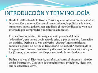 La introducción define los términos educación, enseñanza y aprendizaje. La enseñanza se refiere a mostrar algo a otros, mientras que el aprendizaje es el proceso complementario por el cual el alumno adquiere conocimientos. La didáctica estudia los procesos de enseñanza y aprendizaje y cómo plasmar teorías pedagógicas en la práctica. Existen tres modelos didácticos principales: el normativo centrado en el contenido, el incitativo centrado en el alumno, y el constructivo donde