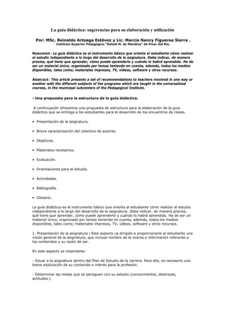 El documento presenta recomendaciones para la elaboración y utilización de guías didácticas para estudiantes. Explica que la guía debe orientar al estudiante sobre qué aprender, cómo aprenderlo y cuándo lo habrá aprendido. Además, propone una estructura que incluye la presentación de la asignatura, objetivos, materiales, evaluación, orientaciones para el estudio, actividades y bibliografía. El propósito es guiar al estudiante en su aprendizaje independiente a lo largo del curso.