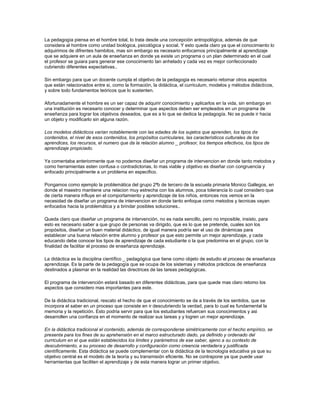 Este ensayo analiza conceptos clave relacionados con la pedagogía y didáctica para fundamentar un programa de intervención. Explica que la pedagogía estudia la educación y busca mejorarla, considerando al estudiante como un ser biológico, psicológico y social. También analiza modelos didácticos como el tradicional, crítico y tecnológico, así como enfoques como el científico-tecnológico y sociopolítico, con el fin de diseñar un programa flexible basado en la te