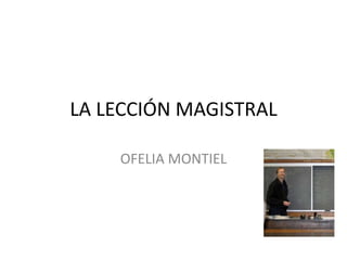 La lección magistral es un método de enseñanza centrado en el profesor que transmite conocimientos a los estudiantes de forma expositiva. Los estudiantes son receptores pasivos que escuchan y toman notas, aunque pueden hacer preguntas. Para ser efectiva, la lección magistral requiere una buena preparación y comunicación por parte del profesor.