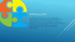 La didáctica crítica es una estrategia educativa que estudia los problemas educativos a través de la reflexión en grupos. Implica analizar la situación de aprendizaje, los roles del docente y alumno, los programas de estudio y la evaluación. La didáctica crítica busca estimular aprendizajes significativos mediante la resolución de problemas reales y la interacción entre docente y alumno para hacer la enseñanza menos tediosa.