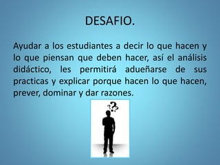 La didáctica crítica es un proceso de análisis de la práctica docente mediante acciones comunicativas emanadas de la teoría crítica, con el fin de mejorar la enseñanza y emancipar a los estudiantes y la sociedad. Implica que los docentes replanteen críticamente su práctica y la apoyen en la investigación y autocritica para construir el conocimiento de forma grupal.