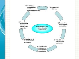 Este documento discute varios conceptos clave en epistemología y didáctica de las matemáticas. Explica que la epistemología estudia el conocimiento y su adquisición, mientras que la didáctica se enfoca en los procesos de enseñanza y aprendizaje. También explora las diferencias entre didáctica, metodología y educación matemática, y analiza varias teorías importantes en didáctica de las matemáticas como la modelización, razonamiento matemático y transposición didáctica. El